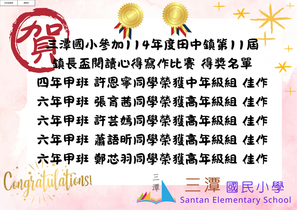 恭喜!!三潭國小學生參加114年度田中鎮第11屆鎮長盃閱讀心得寫作比賽榮獲佳績。