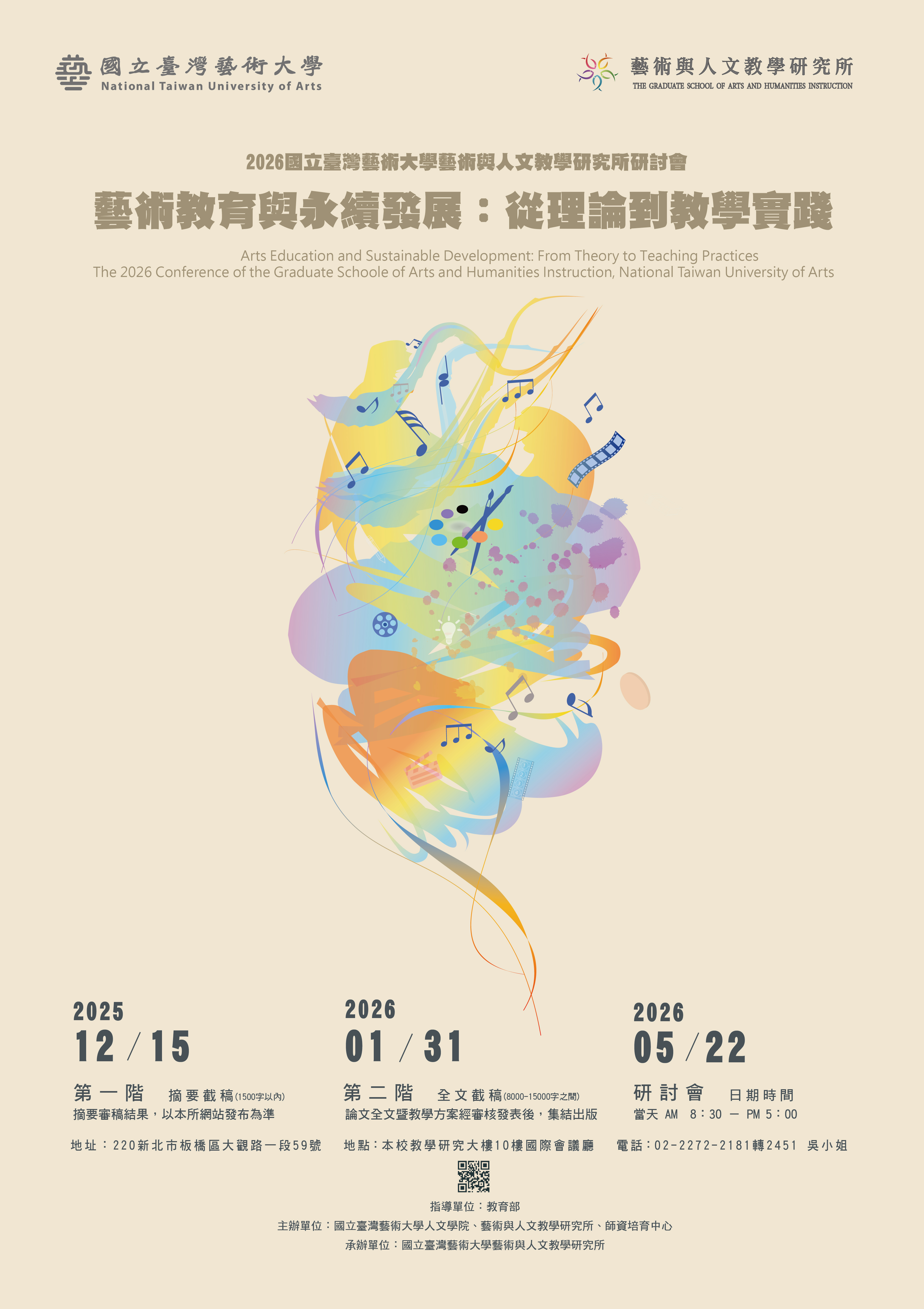 旨揭研討會由國立臺灣藝術大學藝術與人文教學研究所承辦,訂於115年5月22日(星期五)上午8時至下午5時,於該校教學研究大樓10樓國際會議廳舉行。