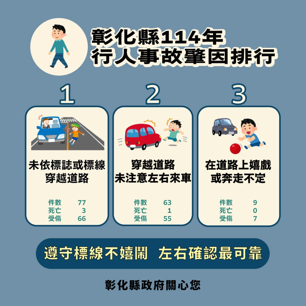 轉知:本縣114年1-12月道路交通事故死傷累計31,255人,請貴單位及所屬機關運用既有宣傳通路協助加強宣導,共同降低死傷人數